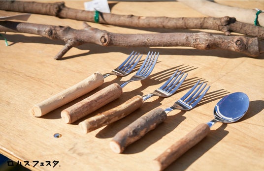 間伐材をアップサイクルして、スプーン&フォークをつくったり、イベントで使用した看板用テント布でマイバッグをつくるワークショップなど、大人からお子さままでモノづくりの楽しさを感じていただけます。