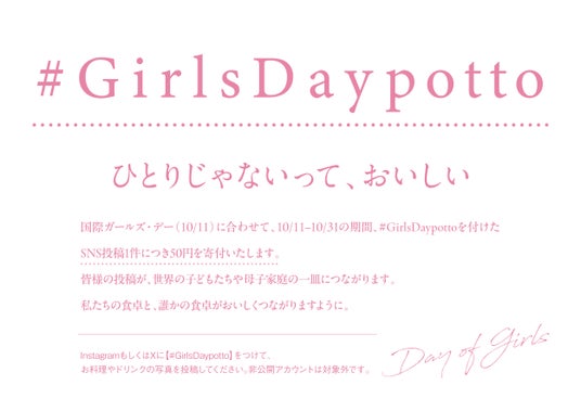 10/11(国際ガールズ・デー)から、日本、そして世界の女の子の"明日"に支援が届く参加型企画を開催。『食べる』『撮る』『#GirlsDaypottoをつけて投稿』- 小さな一歩を、いっしょに。
