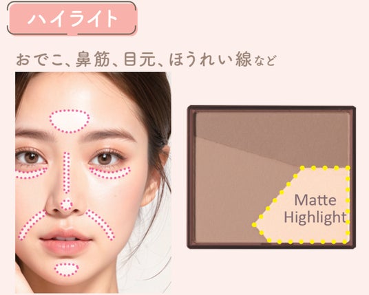 2色の濃淡が異なるシェーディングに加えて、マットハイライトを仕込むことで、メリハリ立体感を演出できます。また、絶妙な発色で塗っていることが分からないくらい自然な仕上がりなのもポイントです。鼻筋やフェイスライン、おでこ、クマといった各ポイント全てにお使いいただけます。