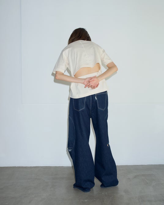 "染色しない"ことをコンセプトにした「UNDYED」の素材を使用したTeeシャツ。オーガニックコットン本来の色をそのまま活かし、無染色ならではの柔らかさと心地よさが魅力です。細めの五分袖とややゆったりとしたシルエットで、大人な印象に。背中の大胆なカッティングがポイントとなり、カジュアルながらも抜け感のあるスタイルを演出します。