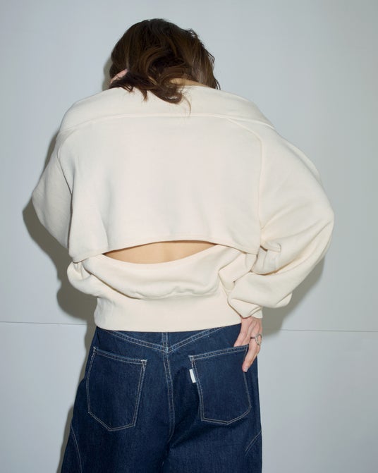 "染色しない"ことをコンセプトにした「UNDYED」の素材を使用したオフショルダースウェット。オーガニックコットン本来の色をそのまま活かし、無染色ならではの柔らかさと心地よさが魅力です。リブ仕様のネックで着心地が良く、ゆったりとしたシルエットでラフに着られます。背中の大胆なカッティングが女性らしさを引き立て、ベロアスカートなどを合わせたミックススタイルもおすすめです。