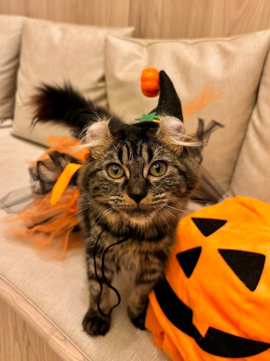 ハロウィン衣装を着た猫ちゃんを抱っこして撮影&おやつタイム!