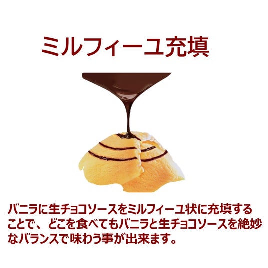- バニラに生チョコソースをミルフィーユ状に充填することで、どこを食べてもバニラと生チョコソースを絶妙なバランスで味わう事が出来ます。