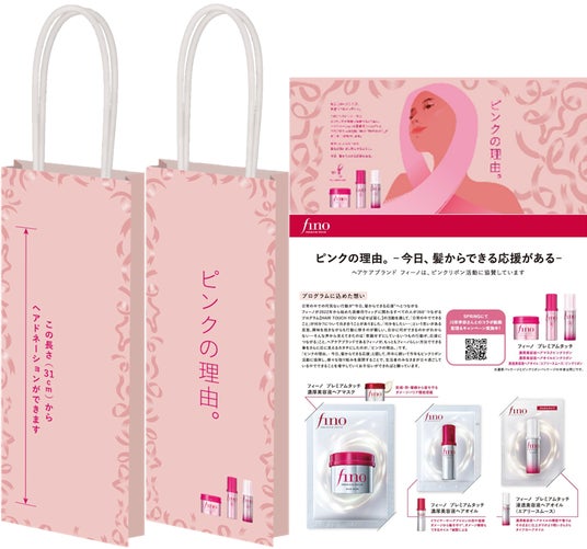 内容:フィーノが展開する3商品がピンク色で展開。ピンクのフィーノ1個購入につき10円を医療用ウィッグプログラムの支援団体である「ふくりび」に寄付し、医療用ウィッグの制作・寄贈に役立てます。