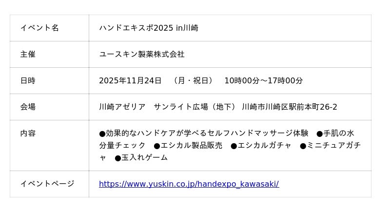 ユースキン製薬株式会社(本社/神奈川県川崎市 代表取締役社長/野渡毅之)は、ハンドケアの普及啓発のためのイベント「ハンドエキスポ」を、2025年11月24日(月)に川崎アゼリア サンライト広場(地下)にて、開催します。