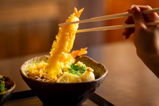 天ぷら蕎麦は、冷たい出汁と温かい出汁からお選びいただけます。ぷりぷりサクサクで揚げたてのエビの天ぷらを贅沢に盛り付けました。