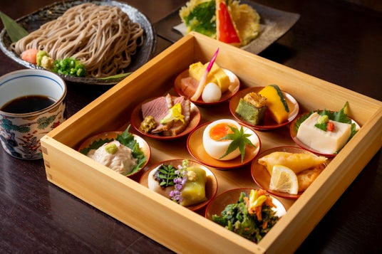 京都の家庭料理「おばんざい」をヒントに、九つの小鉢に丁寧に盛り付けた季節の味覚が、美しい檜の器に華やかに並びます。