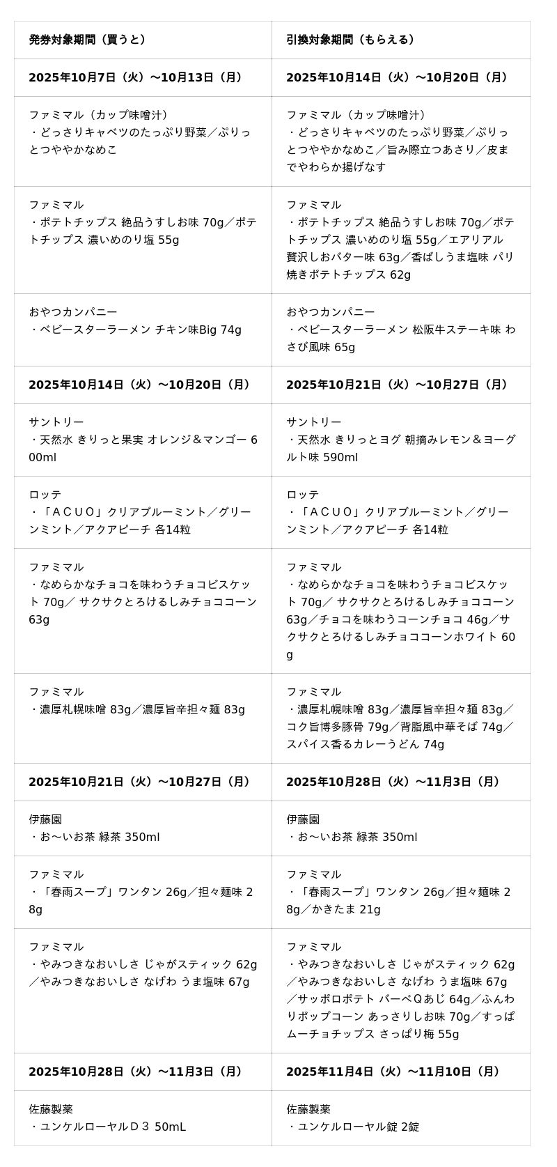 株式会社ファミリーマート(本社:東京都港区、代表取締役社長:細見研介)は、継続して取り組んでいる5つのキーワードのうち「たのしいおトク」、「『あなた』のうれしい」の一環として、ファミマのアプリ「ファミペイ」(以下、ファミペイ)内で「1個買うと、1個もらえる」キャンペーンを2025年10月7日(火)から全国のファミリーマート約16,300店にて実施いたします。さらに、食品や飲料など約140種類以上の割引クーポンを順次配信いたします。10月は約3,000品目の食品が値上げする中、ファミペイを通じてお客さまの生活を応援いたします。