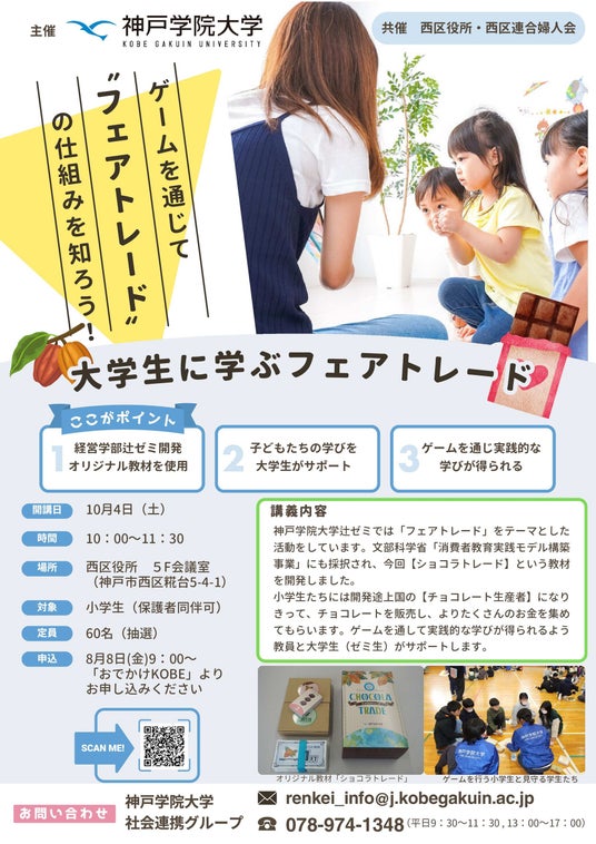 神戸学院大学経営学部 辻幸恵教授辻ゼミで開発した、体験型教材【ショコラトレード】(※)でゲームを通して、楽しみながらフェアトレードの大切さを学ぶイベントを実施します。