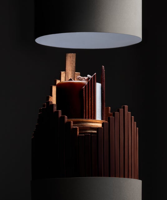 チョコレートにヘーゼルナッツとオレンジを合わせた、なじみのある組み合わせでありながら奥深い味わい。柑橘の果実や花のような香りが特徴のカカオハンターズ「エレガンテ」を使用し、オレンジの爽やかな酸味とヘーゼルナッツの香ばしく濃厚な味わいを様々なパーツに施し、層を重ねました。ひと口サイズに凝縮された気品ある味わいと、つややかで美しくたたずむシルエットが、高貴なチョコレートの世界を表現しています。