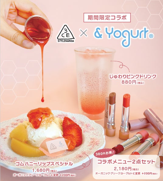<コラボレーション概要>"とろけ出すツヤと蜜感カラー"という特徴から、「#コムハニーリップ」が愛称の「3CE グレイジーリップグロウ」。この度、韓国発のフードトレンドとして日本でも広がりを見せているコムハニーのトッピングを特徴とするグリークヨーグルト専門店「&Yogurt」と特別に共同開発したコラボメニューを表参道店・横浜店で期間限定で販売いたします。さらに、ご来店のお客様には豪華な限定特典もご用意しております。