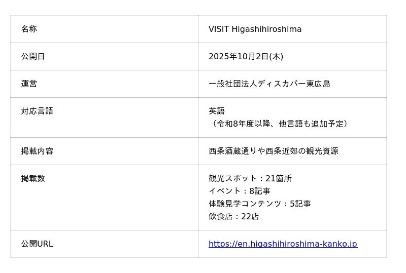 2025年10月2日(木)、一般社団法人ディスカバー東広島は、外国人観光客向け英語の観光サイト「VISIT Higashihiroshima」を公開しました。本サイトは外国人観光客に対し、英語で東広島市の観光情報をわかりやすく、効果的に発信することを目的としたウェブサイトです。