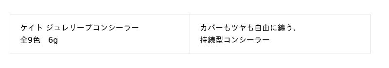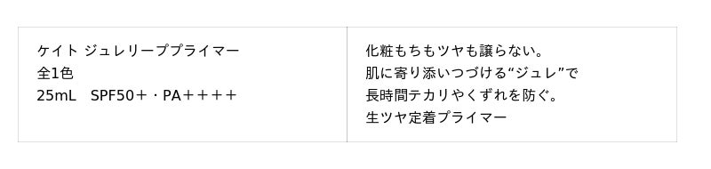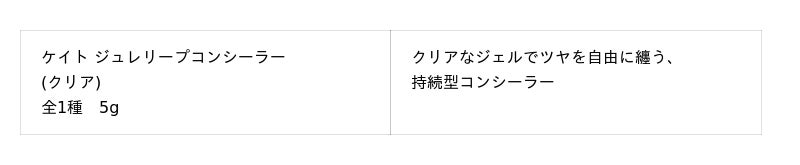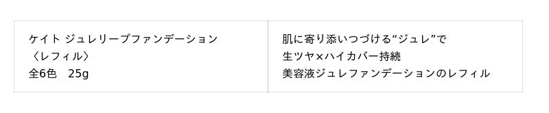 メインアイテムとなる『ケイト ジュレリープファンデーション』は、ファンデーションのカバー素材や「ムーンライトパール*3」などが"美容液ジュレ"に包まれ、肌の上にネットワークを形成し、なめらかな塗膜となり密着します。美容液ジュレが肌に柔軟に寄り添いつづけ、さらに、皮脂と混ざってもくすまず明るいツヤ仕上がりを維持。高いカバー力とツヤ感を持続する"美容液ジュレファンデーション"です。