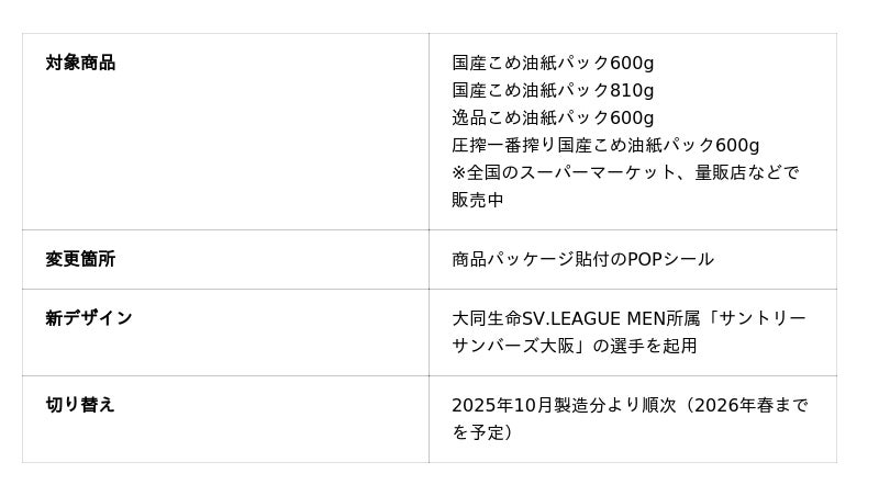 「お米の油は、つの食品。」築野食品工業株式会社(本社:和歌山県伊都郡かつらぎ町 代表取締役社長 築野富美(https://www.tsuno.co.jp/ )は、紙パックタイプこめ油各種のPOPシールデザインを新デザインへ一新いたします。当社は昨シーズンに引き続き、2025-26シーズンもバレーボールチーム・大同生命SV.LEAGUE MEN所属「サントリーサンバーズ大阪」とオフィシャルパートナー契約(プラチナパートナー)をしており、新デザインには期間限定で同チームの選手を起用しております。2025年10月製造分より順次切り替えを開始いたします。