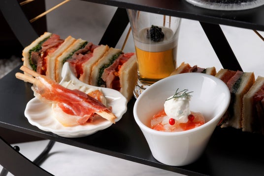 (下段)コンソメジュレとカリフラワーのヴルーテ キャヴィアリ キャビアとフレーバーオイル / スコットランド産アトランティックサーモンとホタテのタルタルソースエイグレット / 生ハムグリッシーニとクリームチーズのムース / 独自の調理法で加工した松阪牛フィレのインダイレクトロティ"シグネチャーサンド"