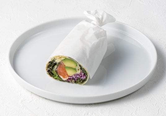 「アボカドとサーモンのバジルラップサンド」たっぷりのサラダとアボカドとサーモンをトルティーヤで巻いたラップサンドです。