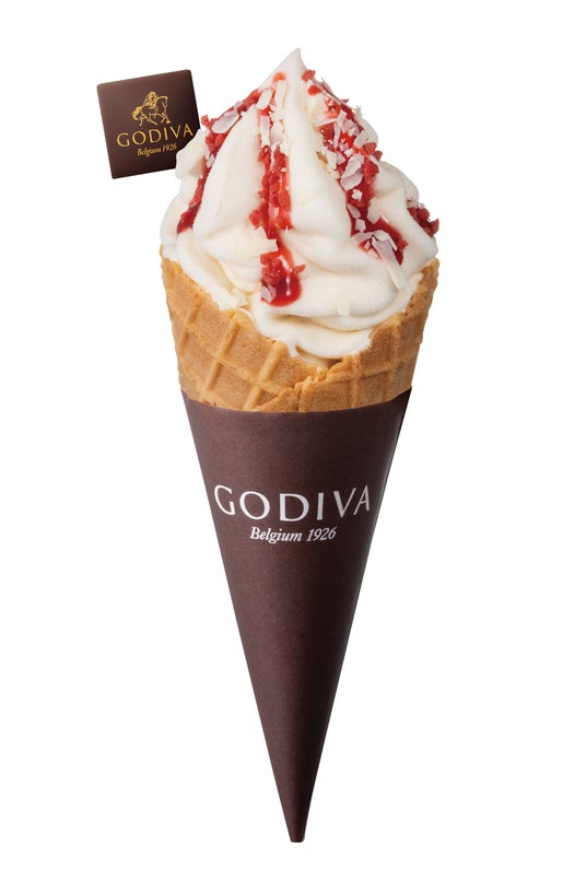 「ソフトクリーム ホワイトチョコレート&ストロベリーアイス」ホワイトチョコレートのソフトクリームを使用したパフェ風のソフトクリーム。いちごのアイスやソースとのマリアージュをお楽しみいただけます。