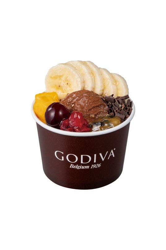 「アサイーボウル トロピカルフルーツ&ダークチョコレートアイス」ゴディバの濃厚な風味のチョコレートソフトクリームと爽やかなアサイーソルベに、フルーツとチョコレートをトッピングした沖縄限定のデザートです。