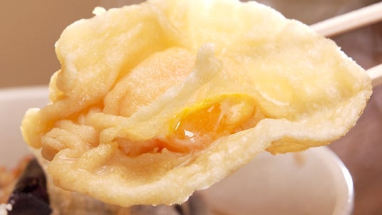 その中から塚地が選んだのは、玉子天とナス納豆天で「(券売機に)1000円入れて、玉子天・ナス納豆天・かけそば、全部買えた。めちゃくちゃリーズナブル」と価格設定にも大喜び。「ナスのトロっとした感じに納豆のネバネバ、ネギ、大葉の食感。旨味が閉じ込められて美味しい。(玉子天は)レンゲで上げないといけない柔らかさ。このトッピング、シンプルだが考えたことない」と今まで食べたことのない天ぷらに「おそばの可能性を感じた」と興奮して話す塚地だった。