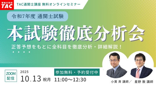 通関士、不動産鑑定士、宅建士、司法書士、日商簿記検定、公認会計士、公務員などの資格取得に向けた教育サービスを展開しているTAC株式会社(東京都千代田区、代表取締役社長:多田敏男)は、2025年10月5日(日)に実施される令和7年度(2025年度)通関士試験の「本試験講評会」を、同日19:00からYouTube Liveで開催いたします。