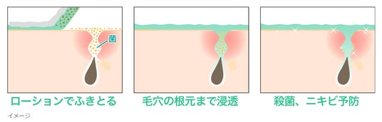 - 肌の余分な汚れ・皮脂をふきとりながら殺菌し、ニキビを予防します。