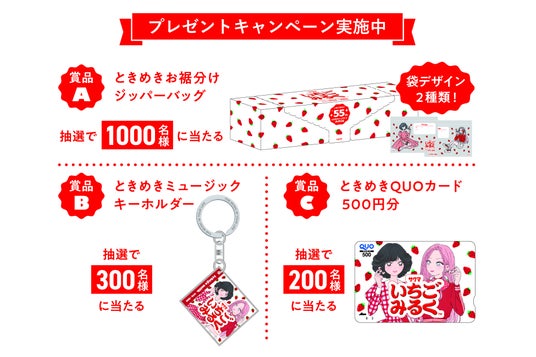 現在発売中の、イラストレーター・たなかさんのイラストが施された55周年記念パッケージ商品をご購入いただいた方の中から抽選で、特別なアイテムが当たるプレゼント企画を実施しております。アイテムの1つ「ときめきミュージックキーホルダー」は、スマートフォンにかざすと、ずまさんと鬼頭さんのコラボ楽曲が収録されている他、鬼頭さん単独バージョンの楽曲、お二人の対談音声もお聴きいただけますので、ふるってご応募ください。応募方法の詳細はキャンペーンサイトからご確認ください。
