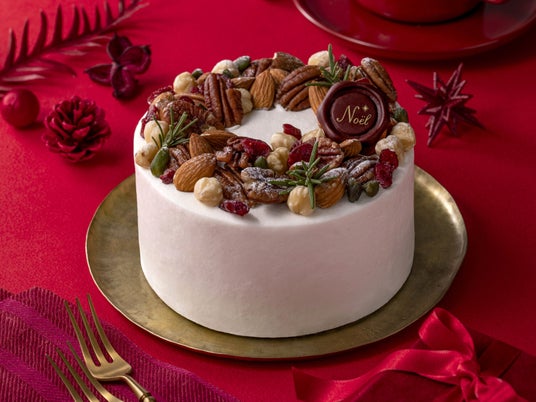 ショコラの深みとナッツの香ばしさにベリーの酸味が華やかさを添える、大人のノエルケーキ。しっとりと焼き上げたチョコスポンジに、なめらかなチョコクリームと生クリームを重ね、アクセントに甘酸っぱいベリージャムと香ばしいナッツ&チョコを忍ばせました。トップには、ローストナッツやドライフルーツをふんだんに飾り、リースのように仕上げた、特別なショコラケーキです。