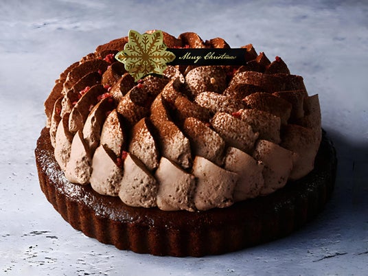 チョコのフリルをたっぷり飾り、まるで「クリスマスのギフトボックス」のような華やかさに仕上げた限定ケーキ。苺のコンポートとラズベリークリーム、口どけのよいチョコムースをホワイトチョコムースで包み込み、外側はチョコレート細工で囲み、華やかなリボンをあしらいました。上にはサンタクロース、プレゼントや雪の結晶などのオーナメントも散りばめられ、甘くにぎやかな聖夜にぴったりです。
