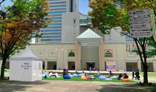 本年もグランモール公園の「美術の広場」に芝生広場が登場。クッションやベンチを用意し、大人から子供までリビングでくつろぐようにゆっくりお過ごしいただけます。