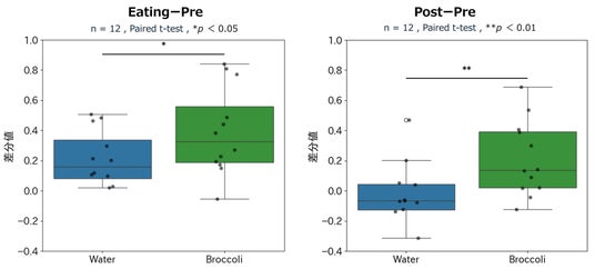 脳波については、摂取前(Pre)と摂取時(Eating)、摂取前と摂取後(Post)の差分の平均は、水に対し、ブロッコリーで、摂取時・摂取後とも有意にMeditation値が高くなりました(図4)。
