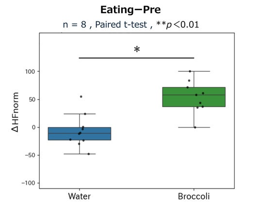 心拍については、摂取前(Pre)と摂取時(Eating)のHFnorm値の差が、水に対し、ブロッコリーで有意に高くなりました(副交感神経活動が優位になりました)(図5)。一方、摂取後は有意差が認められませんでした(グラフなし)。