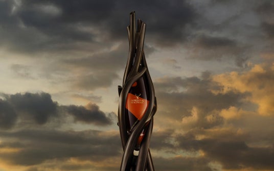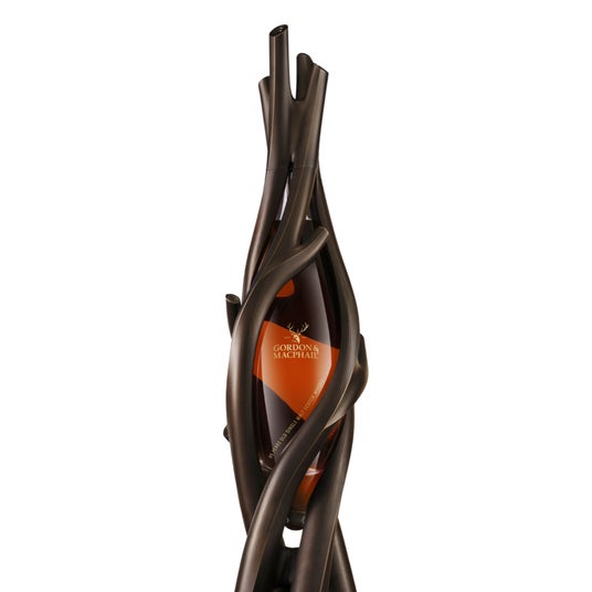 ブロンズ製の4本の枝が螺旋を描きながら上昇し、琥珀色の液体を包み込むデキャンタは、樹木が長い時をかけて宝を育む姿を象徴しています。