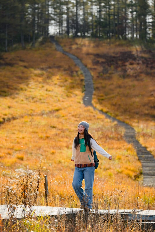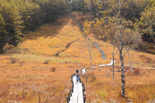 標高1734mの入笠湿原が黄金色にきらめく、秋だけの特別な景観。木道上から、広がりのある俯瞰や草花の近景まで"足元から広がる秋"を楽しめます。