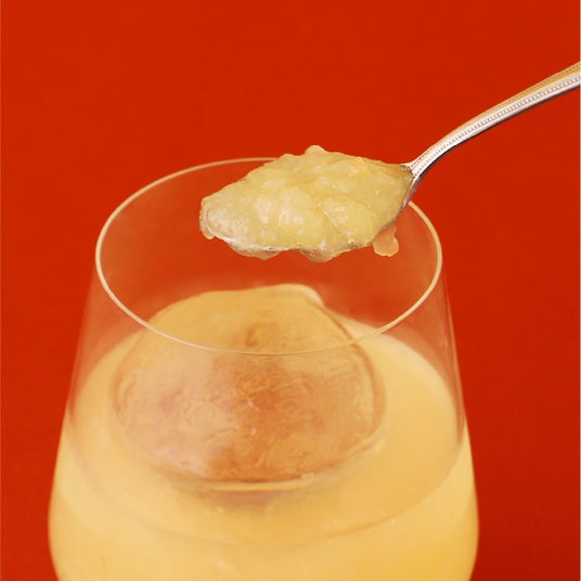 2.果肉のサイズを1.25倍にアップ和梨の魅力のシャリシャリした食感を生かすために、果肉のサイズを1.25倍にアップしました。既存商品の「豊水梨のお酒」では5mmのところ、6mmまで大きくしています。ひと口飲めば、大粒の果肉がごろごろと口いっぱいに広がり、ほかの果物ではなかなか味わえない梨ならではの心地良いシャリシャリとした歯ごたえを楽しめます。"飲む"というより、まるで梨そのものをかじったような"果肉を食べる"感覚のお酒です。