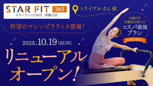 お風呂・サウナに加え、女性専用マシンピラティスが楽しめる新スタイルジムへ--『スターフィット365 津藤方店』が2025年10月19日(日)にリニューアルオープン。10月18日(土)から体験会も開催。