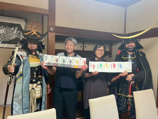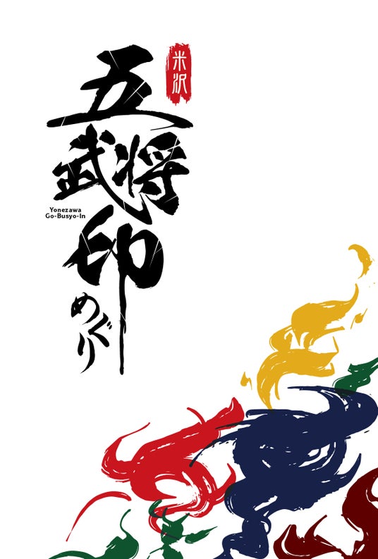 愛の武将隊「五武将印を台紙に押印し、自分なりの書き込みもできる自由度の高い台紙です。また、旅の記念となるだけでなく、ご自宅に飾ったり、お友達と見せ合うこともできるデザイン性の高い五武将印です。米沢で活躍する愛の武将隊とも親和性が高く、米沢を小さくめぐる旅としてぜひ体験いただきたい観光素材となっています。」