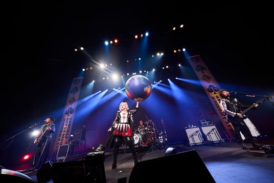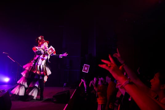 会場が暗転し、アルバムのオープニング曲でもあるインスト「ADVENTURE」が流れるとそこはもう『WHAT A WONDER WONDERLAND』の世界。贅沢にドレープをとった緋色の背景幕、赤と黒のトランプ柄を描いた柱、そしてアルバムブックレットそのままの衣装を纏った4人のメンバー。JILLが「ウェルカム トゥ ワンダーランド!」と叫ぶと、大きな歓声が沸き起こった。1曲目はアルバムの流れと同じく「WONDERLAND」。JILLがB5サイズほどのトランプカードを客席へ次々と投げ入れ、運良くキャッチした観客はカードを掲げて応える。明るいライトがステージを照らす2曲目「SLEEPING BEAUTY」では、楽器チーム3人の表情もよく見えたが、笑顔でとても楽しそう。JILLはジャケット裾のトレーンが遠心力で床と水平になるほどの勢いで回り、頭を激しく振れば長い金髪が大きく揺れて、そのゴージャスさに目を奪われる。