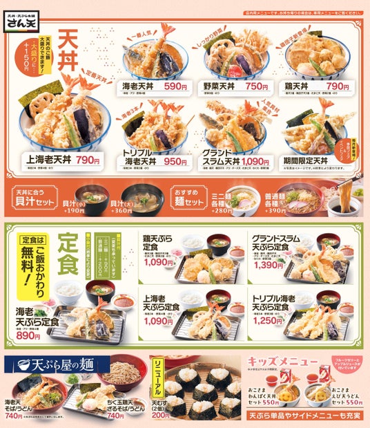 サトフードサービス株式会社(本社・大阪府大阪市、代表取締役社長・杉本 貴之)が運営する「天丼・天ぷら本舗 さん天」では、2025年10月6日(月)より、グランドメニューを刷新いたします。