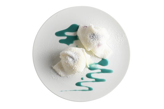マスカルポーネのジェラートに甘酸っぱいベリーソースをしのばせ、やわらかな求肥で包みました。仕上げの青い練乳ソースが幻想的な彩りを添え、雪女のように美しく儚い一品に仕上がっています。
