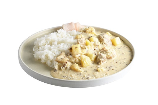 スパイスを効かせつつ、バターとクリームでコクを出した特製の"白いチキンカレー"。仕上げに粉チーズをふりかけ、舞い落ちる雪のような見た目を演出。まろやかさと奥行きが際立つ一皿です。