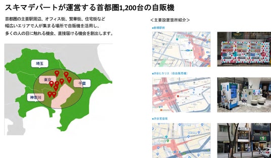 「いろんなスキマから世の中を面白くする」を企業ミッションとする株式会社スキマデパートでは、街にある使われていない"いろんなスキマ"を見つけ出し、そこに新たな価値を創造して世の中に提供しています。最大の強みである全国2,500台の飲料自販機を『自由販売機』と称し、商品を持つ企業の新たな販路となるだけではなく、様々なプロモーションができる広告媒体として新しい価値を創造してきました。"自動販売機のスキマ"が活かされ、自由販売機が社会のインフラとなることを目指します。