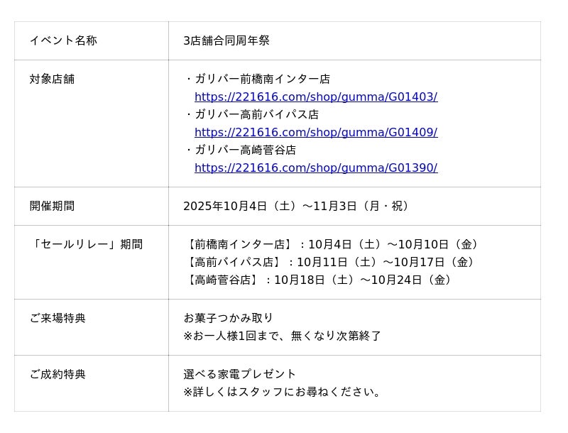 株式会社IDOM(本社:東京都千代田区丸の内二丁目7番2号 JPタワー26階、以下:IDOM)は、群馬県にあるガリバーの大型店舗、「前橋南インター店」「高前バイパス店」「高崎菅谷店」の3店舗が連携し、2025年10月4日(土)から11月3日(月・祝)までの1か月間、初の「3店舗合同周年祭」を開催することをお知らせいたします。