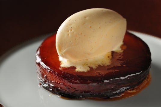青森で世代を問わず愛される林檎を、フランスの伝統菓子「タルトタタン」に仕立てます。そのままひと口頬張れば、キャラメリゼした林檎の香ばしさと、ふくよかな甘みが広がります。合わせるのは、芳醇なカルバドスが香るアイスクリーム。温冷のコントラストが味わいに複層的な広がりをもたらします。一口ごとに変化する林檎の味わいを楽しめる、青森の秋らしいデザートです。
