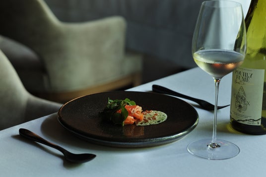スモークを纏わせたサーモンに合わせるのは、りんごや洋梨を思わせる果実の香りと、際立つミネラル感が特徴のソーヴィニヨン・ブランです。フレッシュで軽やかな果実味が、いくらとヨーグルトを合わせたまろやかなソースや、ゆずの香りを添えたクレソンサラダと響き合い、味わいに奥行きをもたらします。ミネラルの清らかな余韻がサーモンの旨みを引き立て、爽やかさとまろやかさが調和するペアリングです。