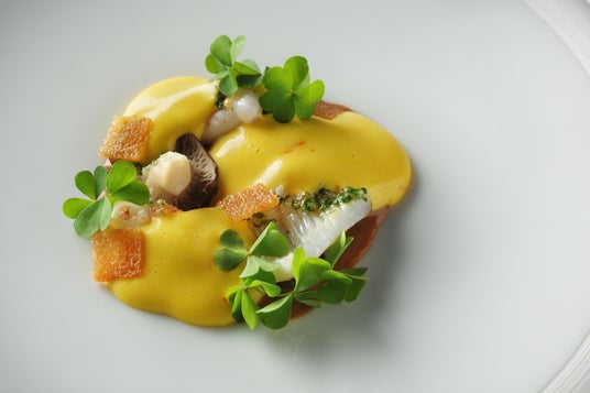 八戸市を中心に沿岸部で親しまれてきた、新鮮な烏賊の身をワタと和えて炒める家庭料理「烏賊のゴロ焼き」に着想を得た一皿です。「海の幸を余すことなく味わう」という港町の知恵に敬意を払い、旬を迎えたスルメイカと力強い旨みを凝縮させた肝のソース、香り高い秋のキノコとともに味わいます。サフランの華やかな香りがふわりと立ち上り、幾重にも重なる味わいが口の中に広がります。暮らしに根付く食文化に想いを馳せながら、味わえる一皿です。