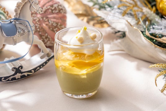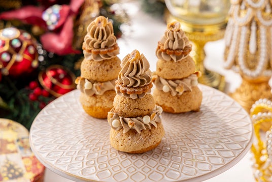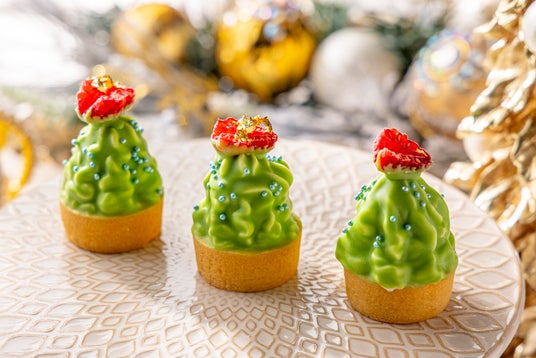スモールポーションのスイーツやグラススイーツもクリスマスらしいラインアップが登場します。ヘーゼルナッツのプラリネ入りカスタードクリームに金柑のコンポートを合わせたクッキーシュークリーム「クリスマスファシネーター」、タルトに柚子風味のミルクチョコレートガナッシュを乗せ、ピスタチオクリームを絞りまるでツリーのような装いの「リトル・リトルツリー」、ロイヤルミルクティームースの中に、レモンのジュレとアプリコットのコンポートが爽やかな「プリンセス・ジュレ・ド・ノエル」など、華やいだクリスマス空間で優雅なスイーツタイムをお過ごしいただけます。