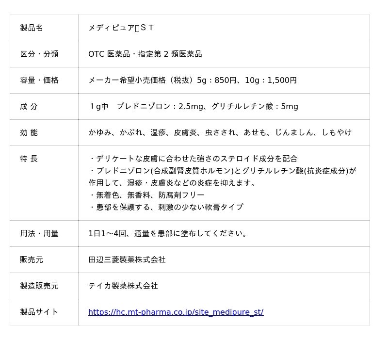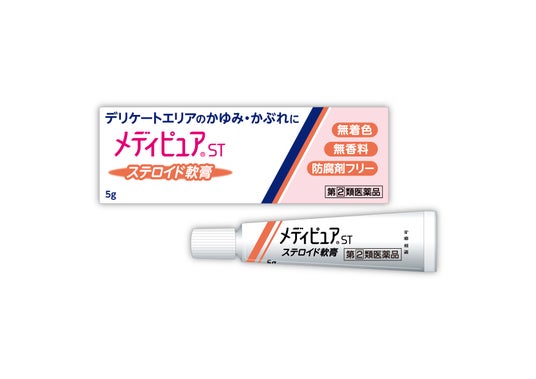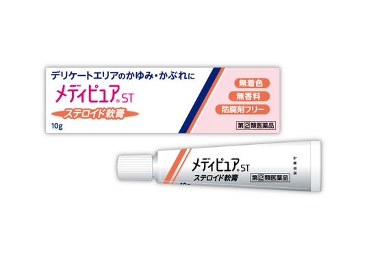 「メディピュア(R)ST」は、ステロイド成分を配合した無着色・無香料・防腐剤フリーの患部への刺激が少ない軟膏タイプの外用剤です。デリケートエリアのかゆみ・かぶれの原因である炎症を、ステロイド成分でしっかりと鎮めて治します。「メディピュア(R)CR」は、2種類のかゆみ止め成分を配合したクリームタイプの外用剤で、デリケートエリアのかゆみ・かぶれを治します。メントール配合により清涼感のある塗り心地が特長です。