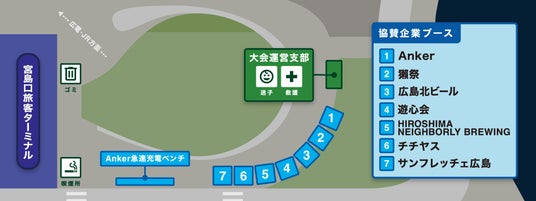 宮島への玄関口であるフェリーターミナルのすぐそばにある「宮島口しゃもじ広場」では、冠スポンサーであるアンカー・ジャパンを始めとする、広島の地域活性化を応援する企業のほか、県内のバラエティ豊かな企業が参加します。