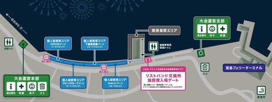 宮島口しゃもじ広場から徒歩圏内、宮島口旅客ターミナルを超えた場所にある指定エリアのスペース内にレジャーシートや折り畳み椅子などをお持ち込みいただけるエリアです。自由席となり1口(1人)当たり「1m×1m(1平方メートル)」までご利用いただくことができます。開場後、先着順でのご案内となります。