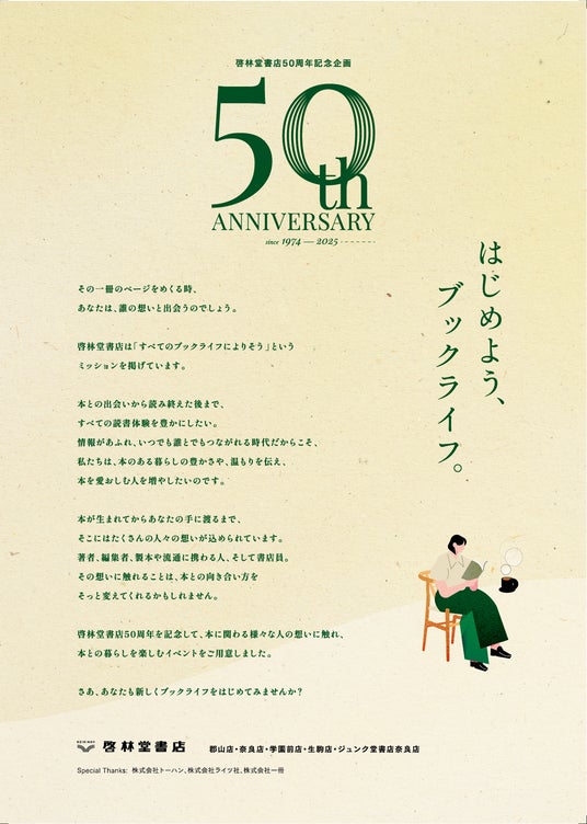 今回の50周年企画では、そのコンセプトを啓林堂書店各店の店頭やイベントへと拡げ、奈良から読書文化を次の50年に繋げたい、という想いを込めています。